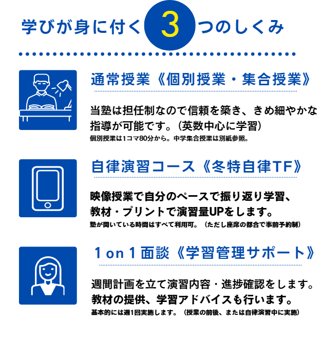 🔹 個別授業(英・数中心)+タイムフリー演習+1on1面談