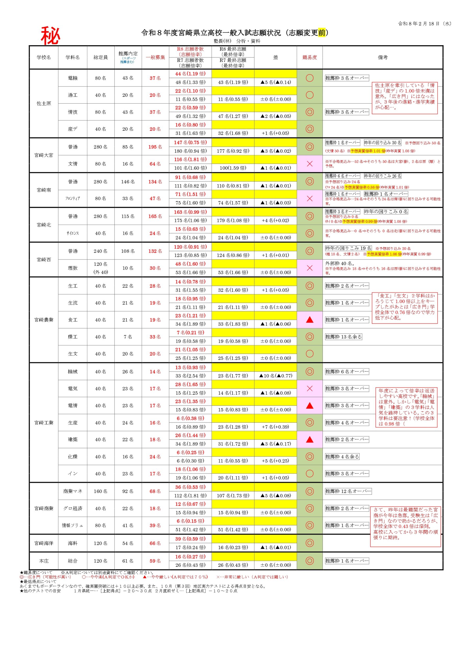 先ほど県教委から「令和8年度宮崎県立高校一般入試」志願倍率が発表されました。