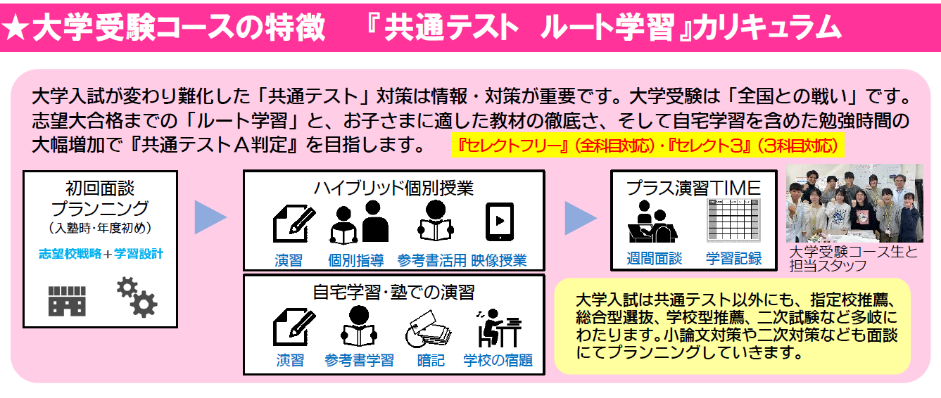 - 「全教科学習できる個別指導」このコースのスローガンです。受験に必要な教科・科目、そして検定対策や思考力養成ができる、これが個別授業形式の「ソクラ」スタイルです。